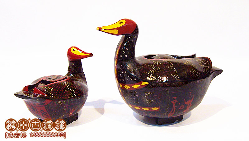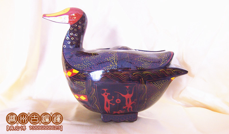 鴛鴦盒為木胎其身,體分兩半,制作再粘合成,頭頸與身體則榫卯相連,故頭能自由轉(zhuǎn)動(dòng)。背上有一長(zhǎng)方形口與蓋相扣合,蓋上浮雕龍紋。整器外髹黑漆,其上用紅色和金色描繪眼、嘴、羽毛以及菱形紋等。在它的腹部還描繪了建鼓舞和撞鐘擊磬的情節(jié)畫。考古顯示為古代宮女漆盒、木豆或胭脂盒。